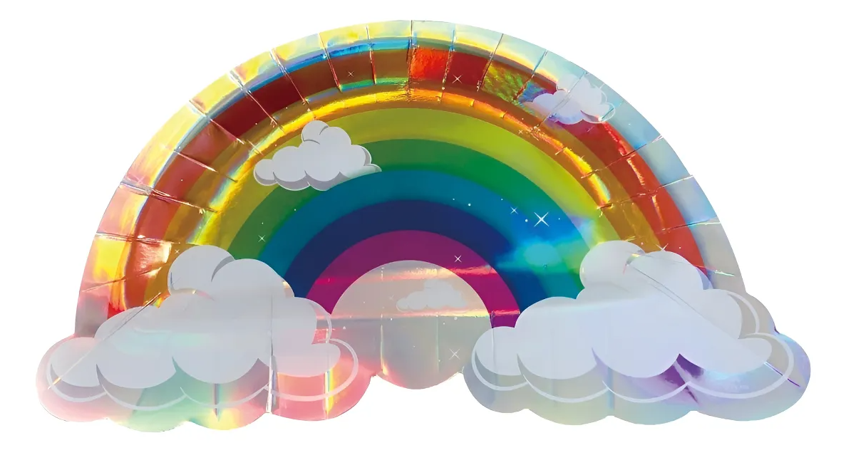 Paquete de 6 unidades de bandejas de polipapel descartables en forma de arcoiris con detalles holograficos, ideal para decorar tus mesas 馃寛